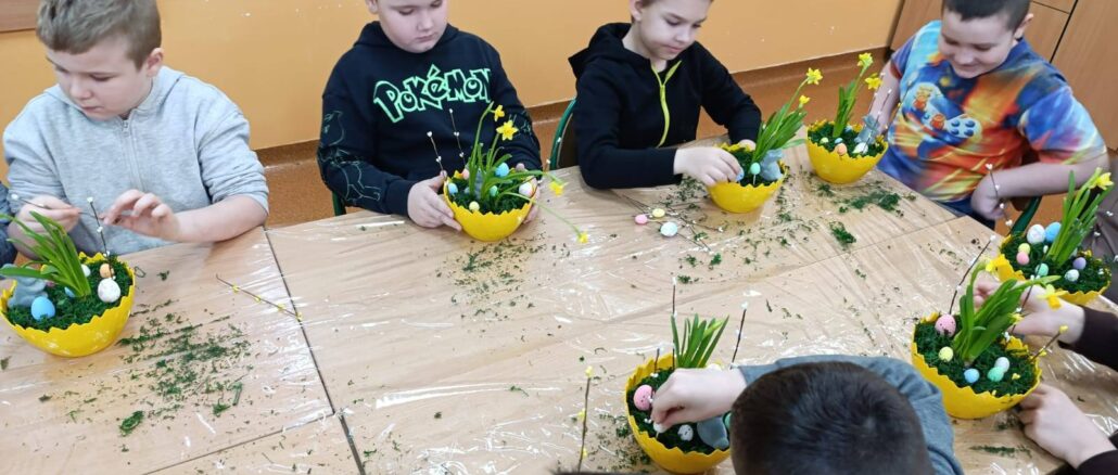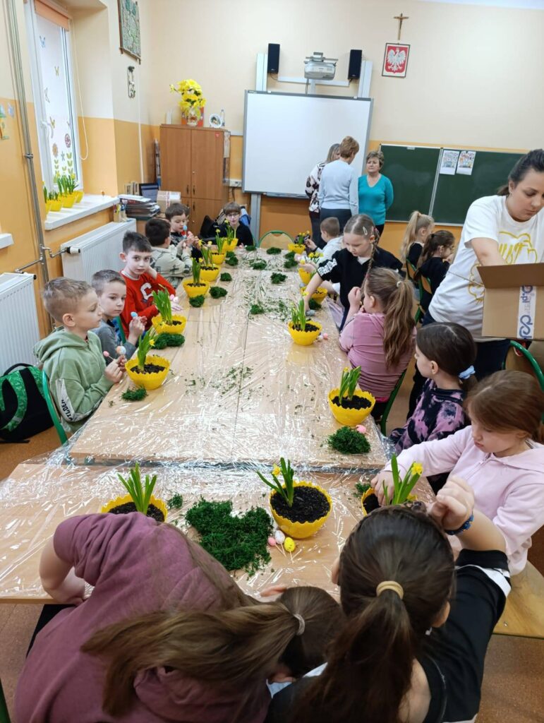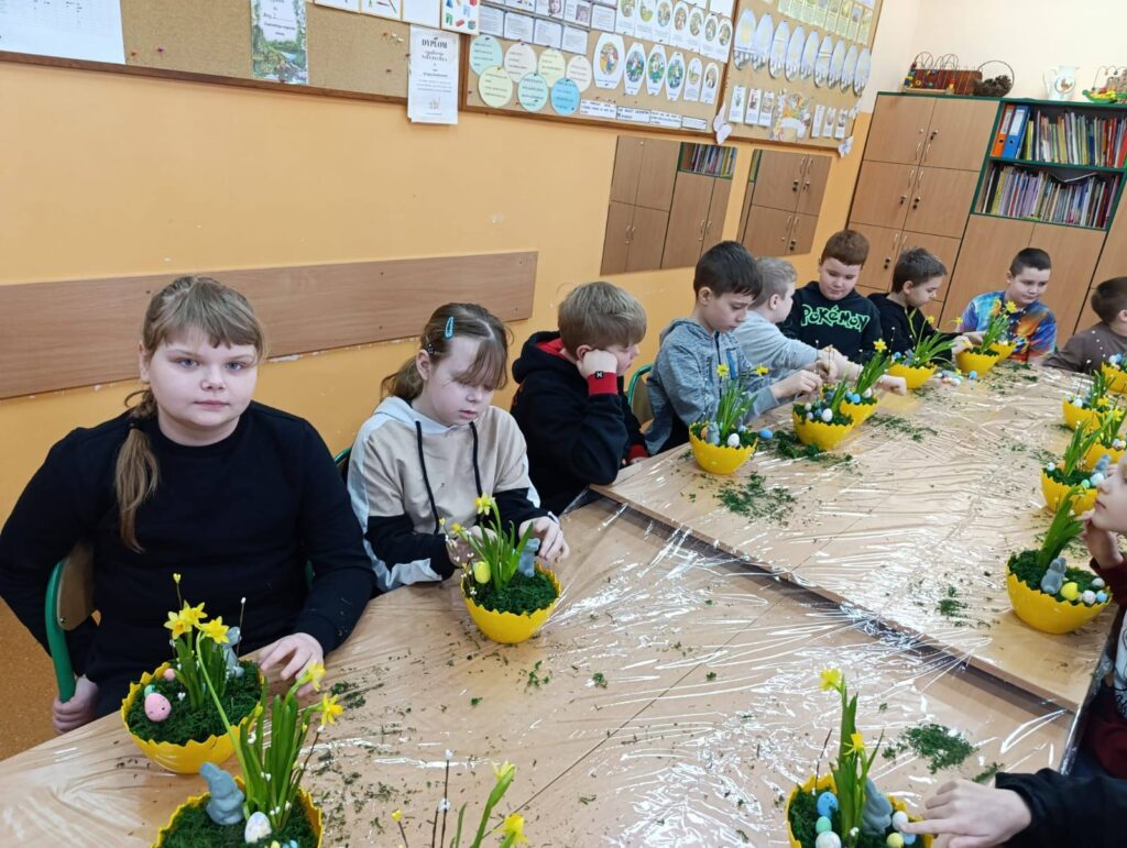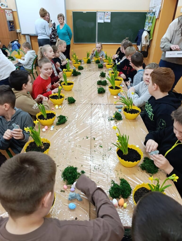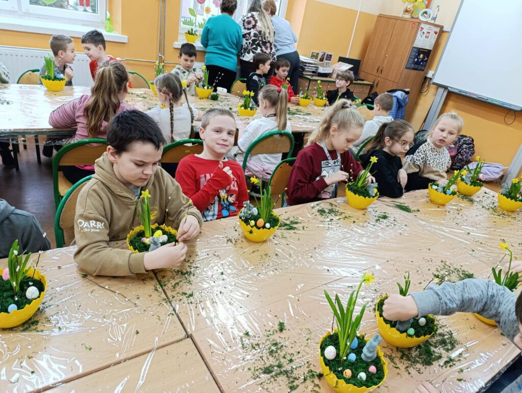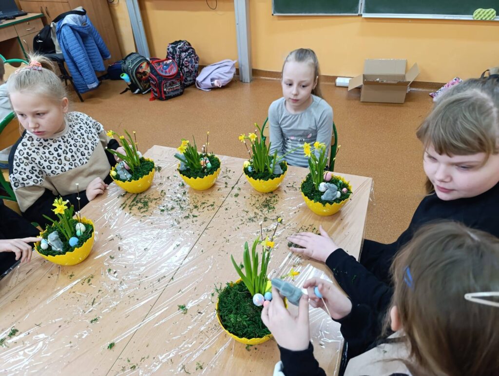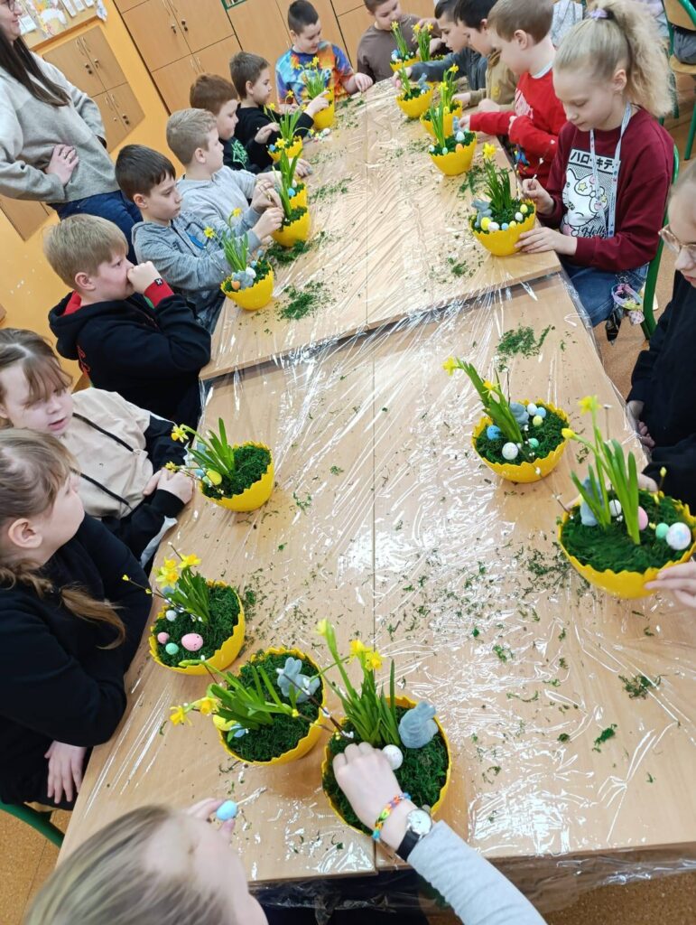 30 marca 2026 r. odbyła się druga część warsztatów wielkanocnych dla uczniów klas 1–3. Dzieci ozdabiały swoje wcześniej posadzone kwiaty dekoracjami wielkanocnymi, takimi jak jajka, zajączki oraz mech. Powstałe kompozycje będą piękną ozdobą stołów wielkanocnych w domach.