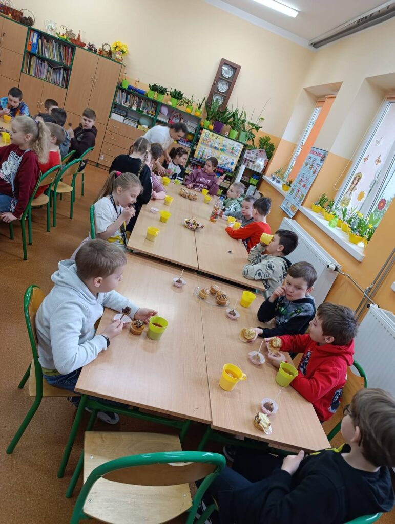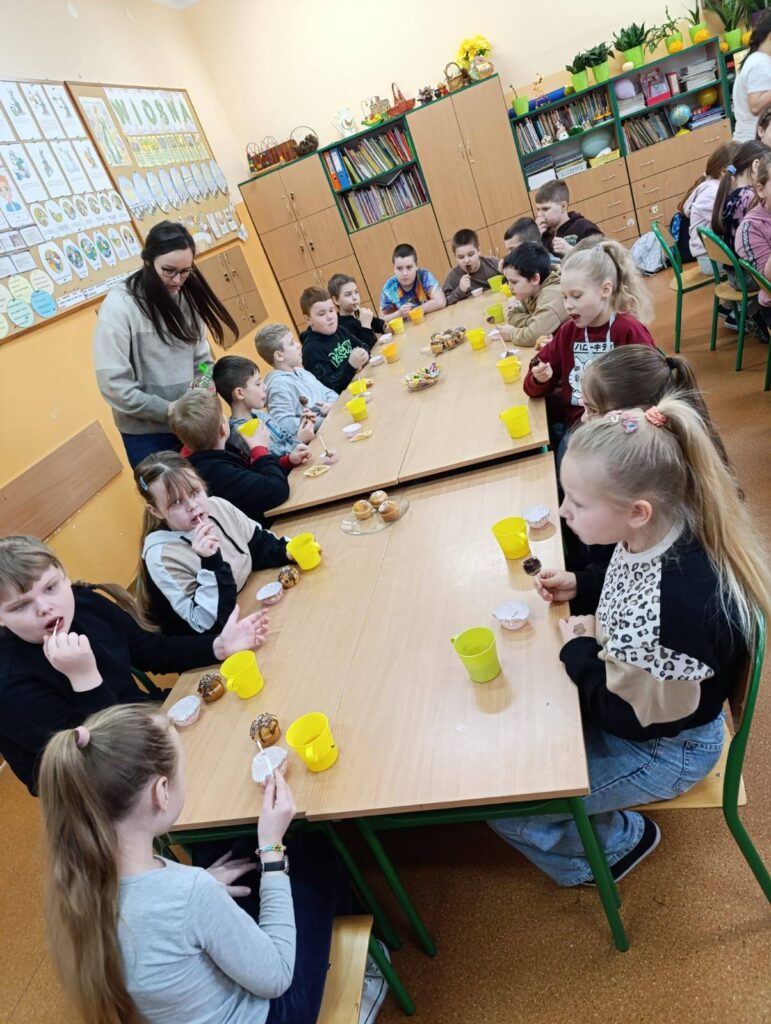 Po warsztatach na uczestników czekał słodki poczęstunek, a na zakończenie dzieci obejrzały krótki film związany z tradycjami wielkanocnymi. Był to miło spędzony, wspólny czas, podczas którego uczniowie mogli zaprezentować swoje zdolności plastyczne.